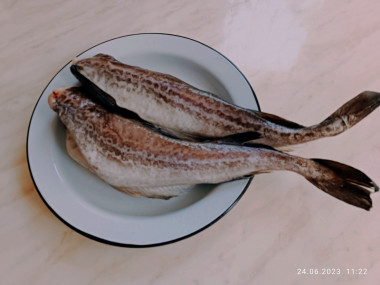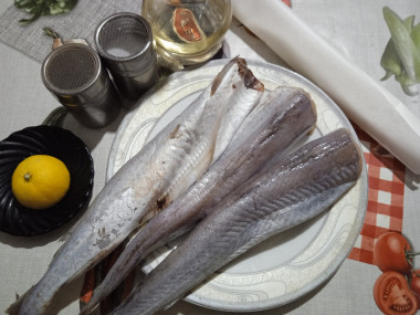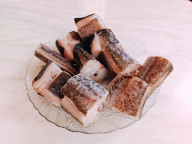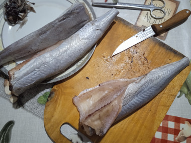 Чтобы рыбу легче было разделать, тушку не размараживаю до конца, а лишь до такого состояния, чтобы без труда можно было нарезать на порционные куски.