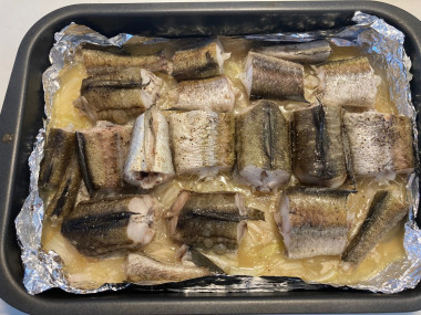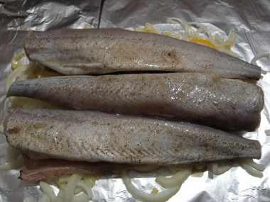Включите духовку разогреваться до 190 градусов. Размороженную рыбу помойте проточной холодной водой, очистите ее от чешуи. Отрежьте у рыбы плавники и хвост, выпотрошите и снимите чёрные плёнки. Возьмите фольгу с учётом того, что нужно полностью завернуть рыбу и выложите на неё тушку. Можно выкладывать всю рыбу, а можно порционно заворачивать каждый кусок или рыбину. Я запекала по две рыбины. Про алюминиевую фольгу читайте статью в конце этого рецепта.
