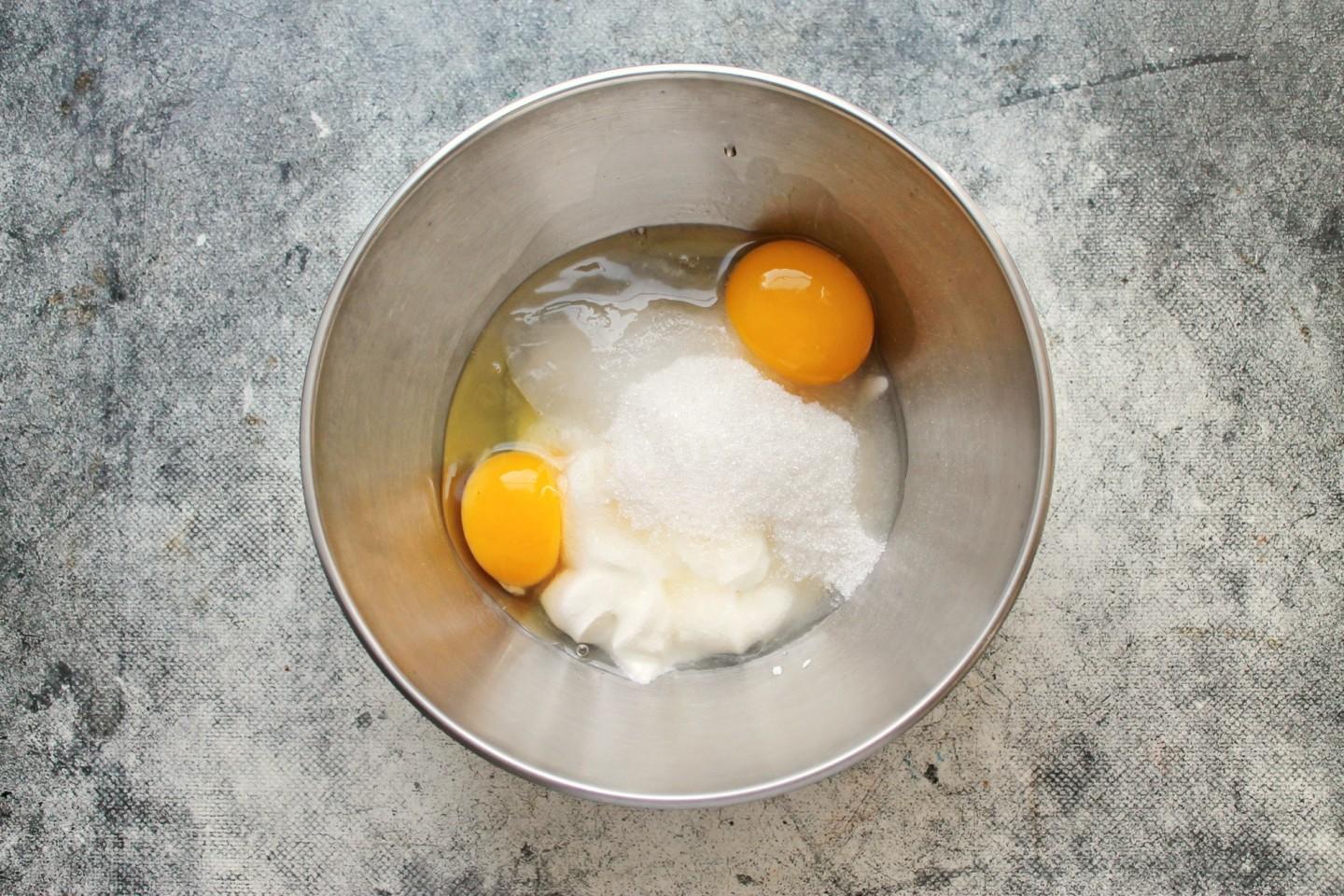 В миску положите сметану, она должна быть густая и лучше жирная. Добавьте в миску сахар, щепотку соли и ванильный сахар. Вбейте в миску яйца и взбейте миксером до однородности и растворения кристаллов.