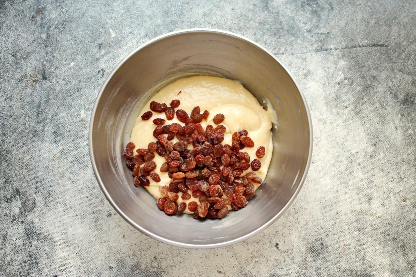Пшеничную муку смешайте с разрыхлителем и просейте в миску. Все аккуратно перемешайте лопаткой до однородного теста по консистенции как сметана средней густоты. Добавьте в тесто подготовленный изюм и перемешайте до равномерного распределения. Подробнее о свойствах муки и нюансах использования разрыхлителя читайте в конце рецепта.