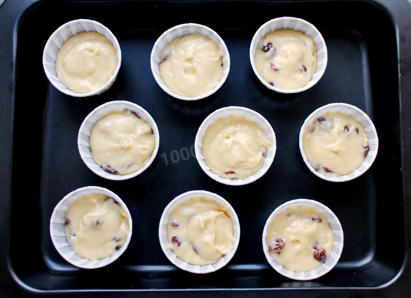 Заполните формочки для кексов тестом на 2/3 и разровняйте верх ложкой. Установите формочки на противень или, если бумажные формочки тонкие, поставьте в углубления формы для выпечки кексов. Также можно испечь кексы на сметане в силиконовых формочках. Все хитрости и нюансы приготовления кексов можно найти в статье под шагами ниже.
