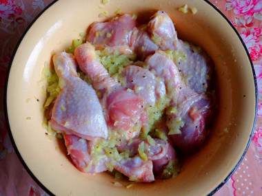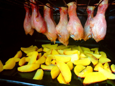 Такой маринад я сделала для куриных голеней. Мариновались они около часа. Готовила голени в духовке, закрепив их на решетке с помощью зубочисток, примерно час. Под них поставила противень с выложенным на нём нарезанным картофелем.