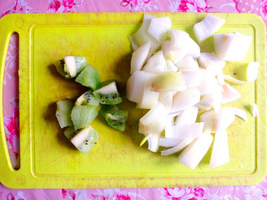 Выложите их в блендер и измельчите до однородного пюре. Вместо блендера можете использовать мясорубку. ! Если вы не любите сильный привкус лука в шашлыке, то измельчайте только киви, а луковицу просто нарежьте кольцами вместе с остальными.