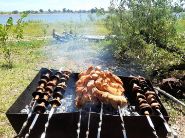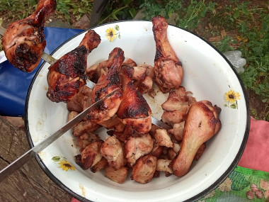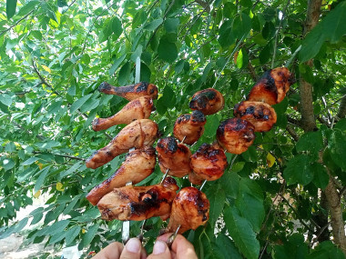 На следующий день муж жарил шашлык на мангале, ножки нанизали на шампура. Готовность определяли по внешнему румяному виду, а так же сделали надрез на самой толстой части. Прозрачный сок без примеси крови говорит о готовности.