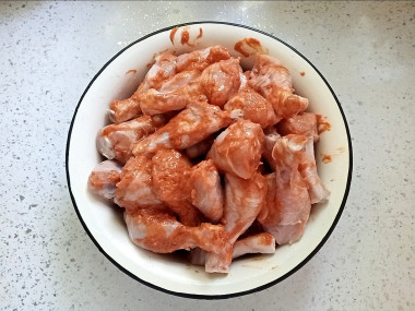 Накройте миску с курицей пищевой пленкой и оставьте мариноваться на сутки в холоде или 6 часов при комнатной температуре (я оставила на ночь на балконе примерно при +10 градусах). В оригинальном рецепте сказано, что можно хранить в маринаде в холодильнике до 7 дней. Лично я не пробовала — у меня больше суток не задерживается.