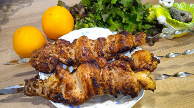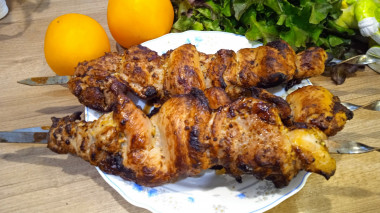 Шашлык из курицы готов. Мясо получается очень мягкое, сочное и ароматное. Подайте его со свежими овощами и соусами. Приятного аппетита!
