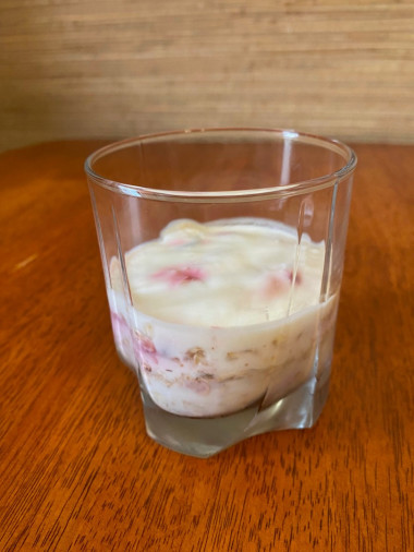 Молоко у меня безлактозное, йогурт взяла клубничный и натуральный в равных пропорциях, а вот семена чиа решила не добавлять - не сильно с ними знакома, поэтому решила готовить без них. Ягоды добавила свежие - малину и клубнику. Так как стаканчики у меня небольшие, продуктов ушло немного меньше, чем указано в рецепте. Кроме того, у меня не оказалось баночек с крышками. Как я вышла из ситуации: стаканчики накрыла плотной фольгой, а сверху замотала пищевой плёнкой.