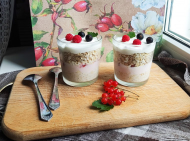 Подготовить ингредиенты. Овсянку берите быстрого приготовления. Подробнее о тонкостях выбора овсяных хлопьев читайте в отдельной статье, ссылка в конце рецепта. Ягодное наполнение может быть любым. Я использовала вишню. Вкусовой йогурт я также взяла вишневый.