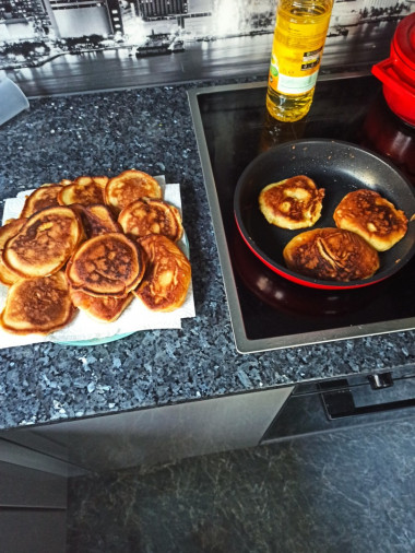 В сковороде разогреть подсолнечное масло. Ложкой выложить оладьи и жарить 1,5-2 минуты с одной стороны и 30 секунд со второй стороны. Завтрак готов.