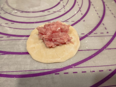 Разложите на кружочки теста мясной фарш и слепите пельмени. Как это сделать и какую форму им придать можно прочитать в рецепте по ссылке под шагами.