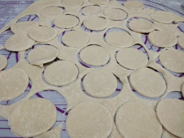 Тесто раскатайте на столе с мукой в тонкий пласт и вырежьте кружочки при помощи выемки или подходящего стакана. Для удобства тесто разделите на несколько частей и раскатывайте их по очереди.