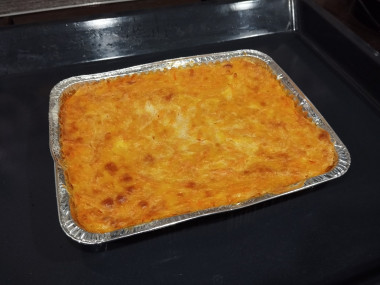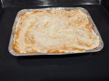 Посуду для запекания смазываем маслом и присыпаем сухарями. Ввести приготовленное тесто. Верхушку пудинга надо смазать сметаной и отправляем в духовку. Запекать приблизительно 25 минут.