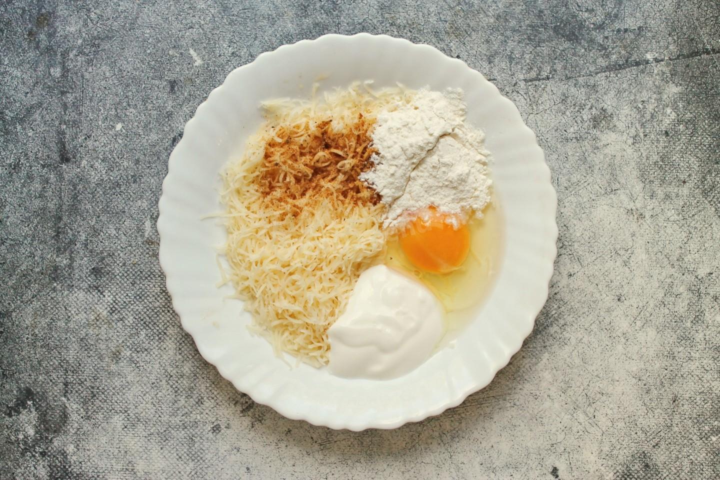 Сыр натрите на мелкой терке и положите в миску. Вбейте к сыру яйцо, добавьте муку, сметану, воду и специи, посолите, поперчите и тщательно перемешайте. Специи можно взять по своему вкусу. Отлично подойдут сухая аджика, сухой базилик, прованские или итальянские травы. Сметану можно заменить натуральным йогуртом, а пшеничную муку на другие сорта. Как правильно это сделать, а также другую полезную информацию о муке вы найдете в материалах под рецептом.