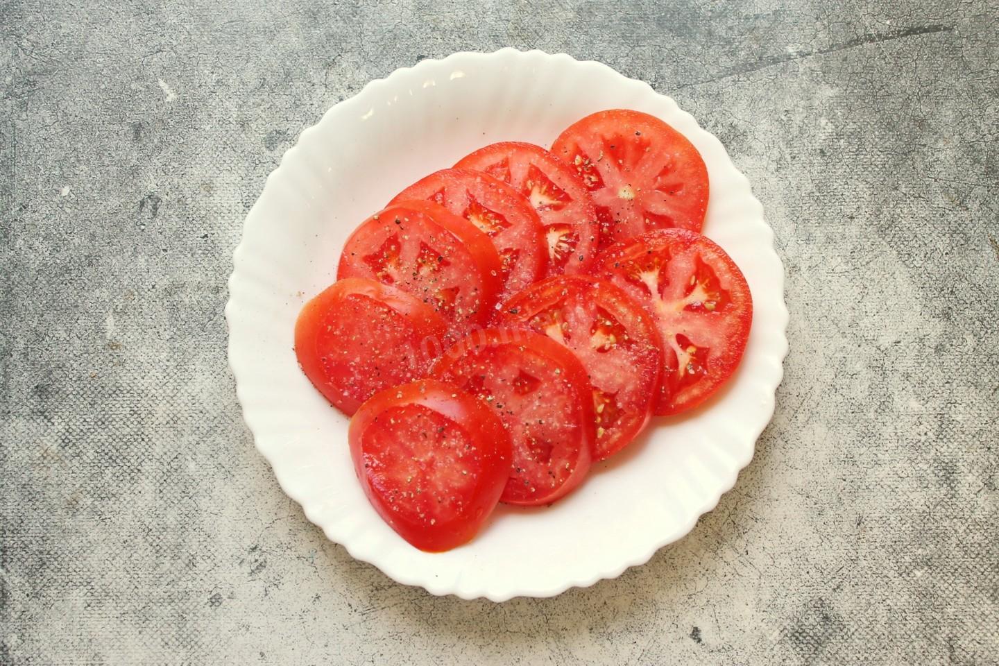 Помидоры нарежьте кружочками толщиной примерно 0.7 сантиметров. Если нарезать слишком тонко, помидоры развалятся. Если нарезать толсто, - не успеют приготовиться. Нарезанные помидоры посолите и поперчите.