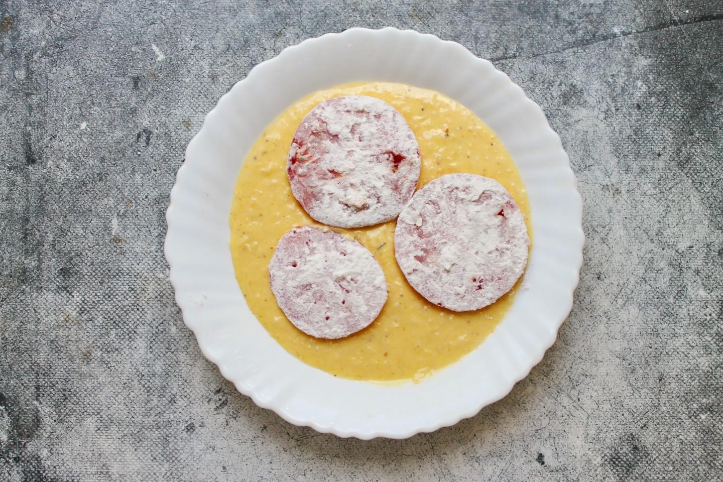 Шаг 6. Как обжарить помидоры в сырном кляре?