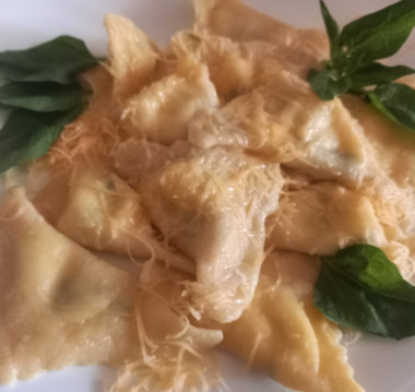 В сковороде растопить масло и обжарить в нём листья шалфея. Ими и украсить равиоли в тарелке, присыпав сверху тёртым сыром. Наши Итальянские равиоли готовы. можно угощаться.