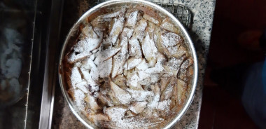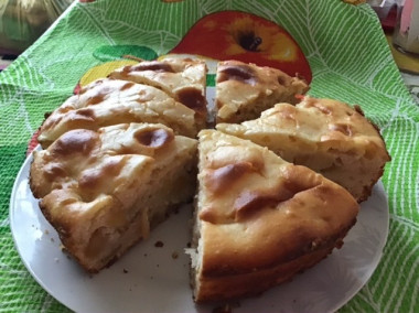Очень простой, вкусный, ароматный пирог. Делала с яблочками из своего сада. Посыпала сахарной пудрой с корицей. За 35 минут тесто пропеклось полностью. Советую обязательно приготовить!