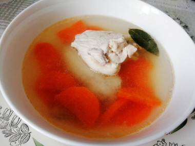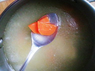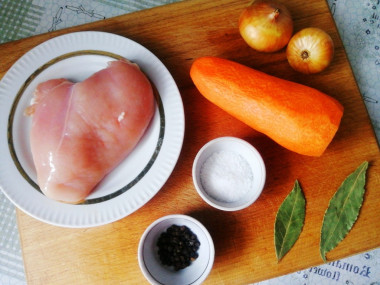 Зная, что готовят сорпу и из птицы, взяла для бульона вместо баранины куриную грудку. Положила ее в небольшую кастрюлю, залила кипящей водой и варила минут 40. Потом добавила нарезанные морковь, лук, перец горошком, лавровый лист. Соль положила в конце.