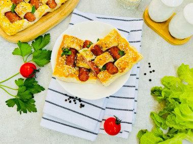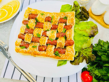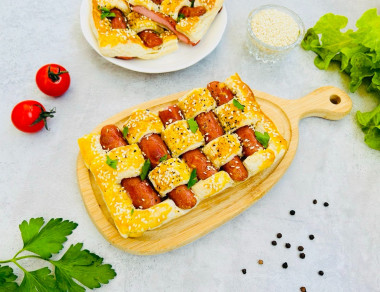 Слоеный пирог с сосисками привлек мое внимание своим внешним видом. Тем более в приготовлении он очень прост и состоит из минимального количества продуктов. Тесто у меня бездрожжевое, замороженное, я его разморозила в холодильнике. Сделала разрезы и продела в них сосиски (сосиски у меня с сыром, я их предварительно отварила.) шахматном порядке, как показано в рецепте. Тесто смазала желтком и посыпала кунжутом. Выложила на силиконизированный пергамент, маслом не смазывала. Запекала при температуре 200 градусов 20 минут. Получилось очень вкусно! Тесто тонкое и хрустящее, а начинка сочная. Идеальное сочетание. Спасибо за рецепт!