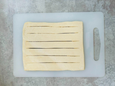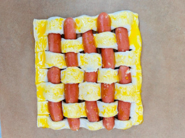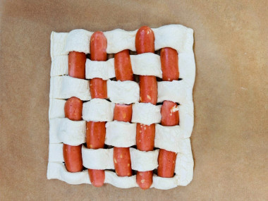 Разморозить слоёное тесто раскатать в прямоугольник не очень тонко. Острым ножом сделать прорезы, не доходя до верхнего и нижнего края по сантиметру. Сосиски отварить в течении 5 минут, предварительно проткнув их в нескольких местах, чтоб не деформировались, слить воду, дать им остыть, а затем очистить и разрезать вдоль на 2 равные части.