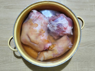 Готовую ножку аккуратно выньте из кастрюли и оставьте на некоторое время на плоской тарелке или подносе, чтобы рулька слегка остыла. Оставшийся бульон можно использовать в дальнейшем для приготовления наваристого супа или борща.
