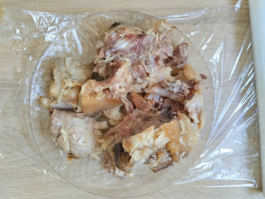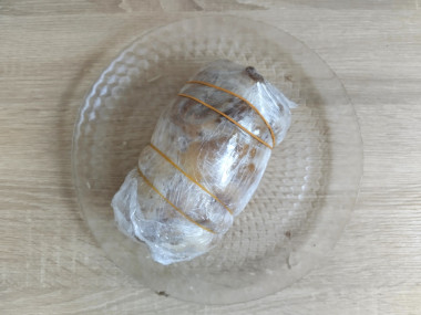Далее обмотайте пищевой плёнкой или заверните в целлофановый пакетик. Уложите ножку в какую-нибудь ёмкость.