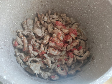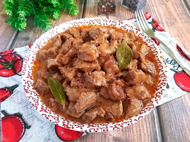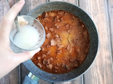 Затем подлейте в сковороду горячую воду. Добавьте томатную пасту, лавровый лист, соль и специи. Накройте сковороду крышкой и тушите мясо минут 40. Длительность тушения будет зависеть от самого мяса. Попробуйте его. Оно должно стать мягким.