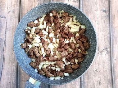 Затем добавьте в сковороду нарезанный лук и перемешайте его с мясом. Обжарьте все вместе 2-3 минуты.