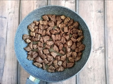 На горячую сковороду налейте немного растительного масла и выложите нарезанное мясо. При жарке из мяса появится много сока. Продолжайте жарку пока вся жидкость не испарится. Как выбрать лучшую сковороду для этого блюда вы узнаете из статьи, ссылка в конце этого рецепта.