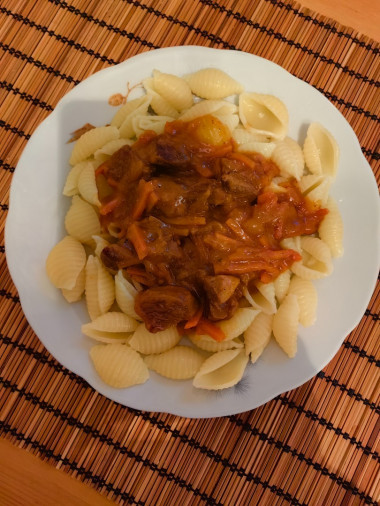 В дополнение к гарниру приготовила поджарку из говядины с подливкой. Мясо у меня было заморожено произвольными кусочками. После разморозки подсушила говядину сначала на сухой сковороде, а затем обжарила с маслом до румяной корочки. После добавления лука подержала на огне минут 10 и залила горячей водой. Тушила вместе с томатной пастой и лавровым листом примерно час. После добавила приправу для мяса, паприку и соль. Мука легко развелась в воде, комочков не было. Такой раствор отлично загущает мясной гуляш! Густота зависит от количества воды. Я взяла по рецепту, получилось довольно много нежной, обволакивающей подливки. Мясо получилось невероятно мягким и сочным! Эта вкусная поджарка подойдет к любому гарниру!