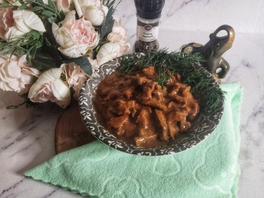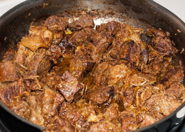 Прогрейте мясо с подливой 1-2 минуты и снимайте сковороду с огня. Дополните блюдо любым гарниром. Приятного аппетита!