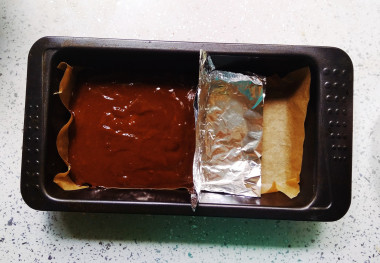 Возьмите форму для запекания, застелите ее бумагой для выпечки. Чтобы бумага лучше укладывалась, предварительно сомните ее. Вылейте в форму тесто и равномерно распределите его лопаткой.