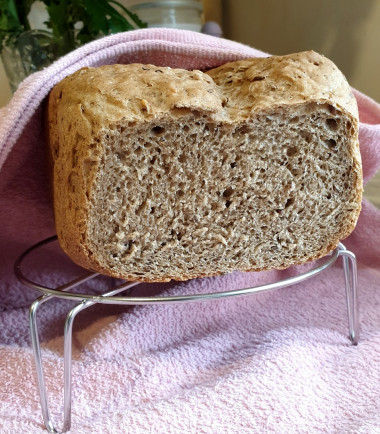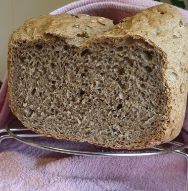 Получилось потрясающе: пористый мякиш, пушистый и нежный, хрустящая корочка, ароматный, очень вкусный хлеб! Добавила кориандр, тмин, семена льна и кунжута. Выпекала на режиме Французский хлеб, корочка как у автора - темная, вес 750 грамм. Да, не такой высокий хлебушек, как если целиком из белой муки печь, но все равно очень здорово получилось. Аромат стоял, как в настоящей пекарне.