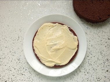 Смажьте нижний корж шоколадной пастой. Вместо нее можно взять вареную сгущенку или взбить сливки.