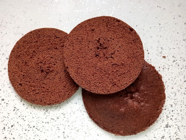 Остывший бисквит разрежьте на 3 коржа.