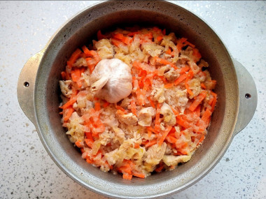 Выложите рис поверх мяса и овощей. Чеснок очистите от верхней оболочки, зубчики оставьте неочищенными. Выложите чеснок на рис и немного утопите в нём.