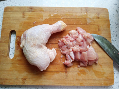 Курицу промойте под проточной водой. Если она не разделана, срежьте мякоть с костей, снимите кожу. Их можно применить в другом блюде, например сварить бульон. Нарежьте мясо на кусочки размером не более 2х2 см. Оботрите полученные кусочки бумажными полотенцами, чтобы не осталось влаги, и при жарке было меньше брызг.