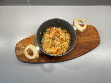 Чтобы лишняя жидкость быстрее испарилась, сделайте в нескольких местах при помощи лопатки углубления до уровня дна кастрюли. Если в них есть ещё жидкость, значит вода еще полностью не выкипела, а если жидкости нет, смело снимайте кастрюлю с огня. Накройте кастрюлю крышкой и оставьте настояться в течение 10-15 минут. Перед подачей плов обязательно перемешайте, а потом выложите его на большое блюдо горкой или каждому порционно. Приятного аппетита!