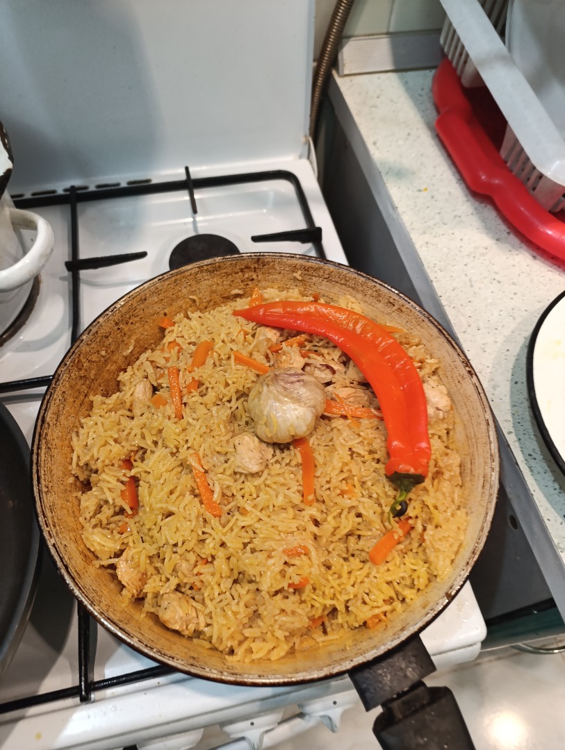 Просто шикарный рассыпчатый плов с курицей в кастрюле на плите получился! Я очень люблю плов из курицы, особенно из мяса, срезанного с окорочков, ведь оно более жирное и вкусное. Готовила в казанке на плите, в нем всегда получается отличный плов. Рис у меня обычный, мои дети любят именно такой, любой другой им кажется сухим) Лук всегда режу кубиками, но сегодня попробовала полукольцами, кажется дети не заметили подмены) Морковь брусочками мне тоже нравится, так она хорошо чувствуется, да еще и пропитывается мясным соком, вкусная, сочная получается. Чеснок положила сразу целой головкой для аромата. Интересно наблюдать как готовый плов "выталкивает" на поверхность мясо, морковь и чеснок) Этот плов получился очень вкусным! Рис нежный, мясо сочное и аппетитное. Спасибо!