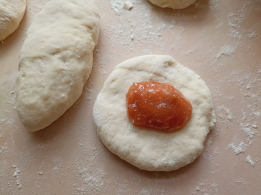 Сформируйте пирожки. Для этого каждый шарик раскатайте в тонкий кружок, в центр положите начинку. У меня это повидло. Для подстраховки в него можно добавить немного крахмала, чтобы повидло не вытекло при жарке. Защипните пирожок, крепко скрепляя края. Сделайте таким образом пирожки из всех заготовок.