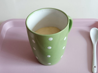 В две высоких кружки объемом 350 миллилитров, которые подходят для микроволновой печки, переложите тесто в равных частях. Тесто должно заполнить кружки на 2/3 высоты, иначе при приготовлении тесто сбежит и выльется наружу.