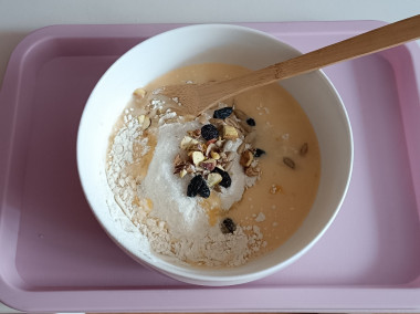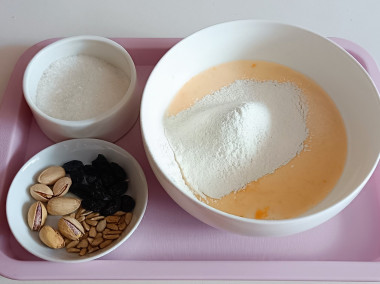 Всыпьте мучную массу в яичную основу, перемешайте до однородного, без комочков муки, тесто. Тесто должно получиться по консистенции как густая сметана. Если оно слишком жидкое, то всыпьте еще немного муки, если, наоборот, слишком густое, то влейте немного молока. Добавьте подготовленный изюм и рубленые орехи.