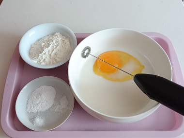 В миску разбейте яйца и перемешайте венчиком. Влейте молоко комнатной температуры и снова перемешайте до однородности.