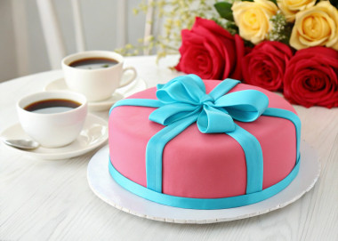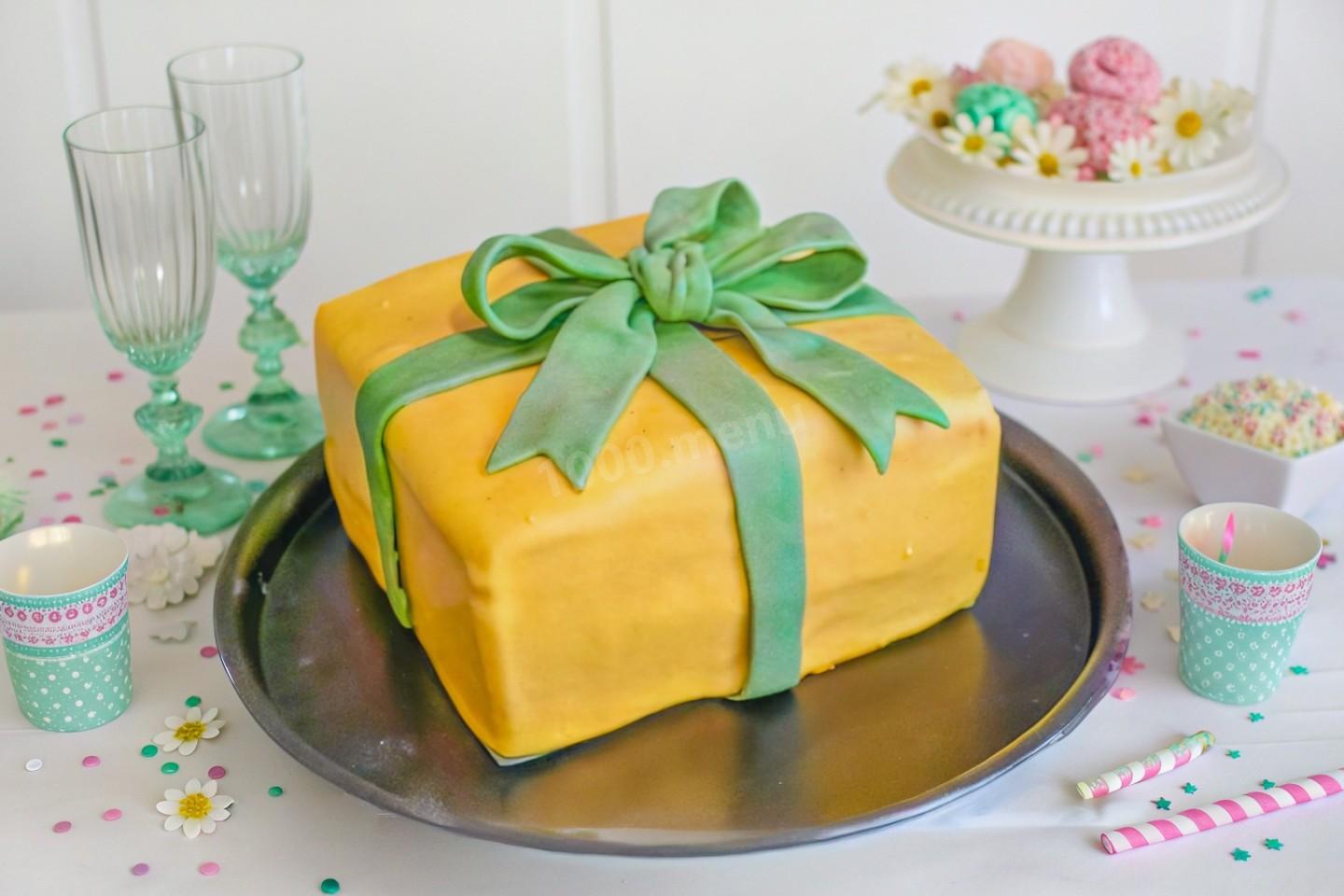 Оберните торт ленточками и украсьте сверху бантиком. Вкусный подарок готов, упакован и украшен - самое время подарить его своим любимым. Веселого всем праздника и приятного аппетита!