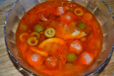 Переложите сосиски в кастрюлю. Следом добавьте корнишоны, оливки, дольки лимонов, лавровые листья и специи. При желании добавьте немного рассола от оливок или огурцов. Чтобы солянка не горчила от лимонной цедры, можете добавить вместо нарезанных лимонов выжатый из них сок.