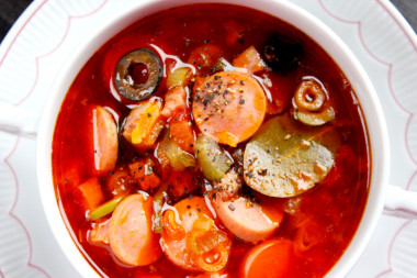 Как сварить вкусную солянку простую домашнюю? Для начала подготовьте необходимые ингредиенты по списку. Помимо сосисок можете использовать и другие копчености: колбасу, ветчину и т.д. Маринованные огурцы можете заменить на соленые, а оливки на маслины.