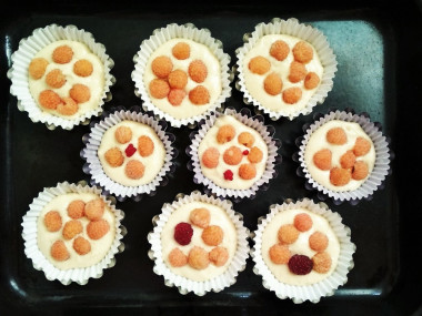 формочки для кексов смазать растительным маслом и наполнить каждую на 2/3 высоты. Поставить формочки в разогретую до 180 градусов духовку на 20 минут.