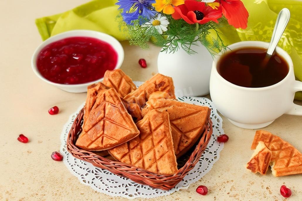 Закройте форму и прижмите обе стороны при помощи ручек. Готовьте печенье на среднем огне буквально по 2-3 минуты с каждой стороны. Оно должно зарумяниться и свободно выходить из формы. Снимите с газа, откройте и удалите вафельное печенье на тарелку. Снова смажьте форму маслом, разогрейте и выпекайте печенье до окончания теста. Дайте ему остыть и подавайте. При желании можно посыпать печенье сахарной пудрой.