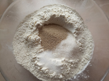 Как испечь ватрушки с повидлом из дрожжевого теста в духовке? Подготовьте необходимые ингредиенты. Варенье можно использовать любое,главное, чтобы оно было густое. У меня было яблочно-сливовое варенье. Муку просейте в глубокую миску. так она насытится кислородом, и готовое тесто получится нежнее и воздушнее. Всыпьте к муке сахар, соль, сухие быстродействующие дрожжи и перемешайте венчиком. При желании можно добавить чайную ложку ванильного сахара.