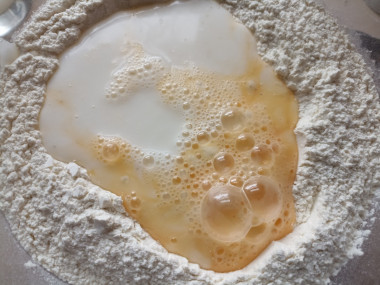 В сухую смесь вбейте яйцо, влейте теплое молоко и растопленное масло.